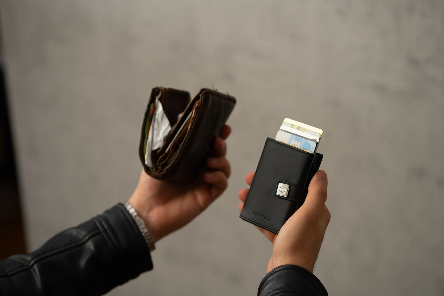Passt in jede Tasche, bietet aber Platz für alles, was du brauchst. Klein, leicht und befreit im Vergleich zu einer dicken Geldbörse. Ideal für Minimalisten, die nichts missen wollen.